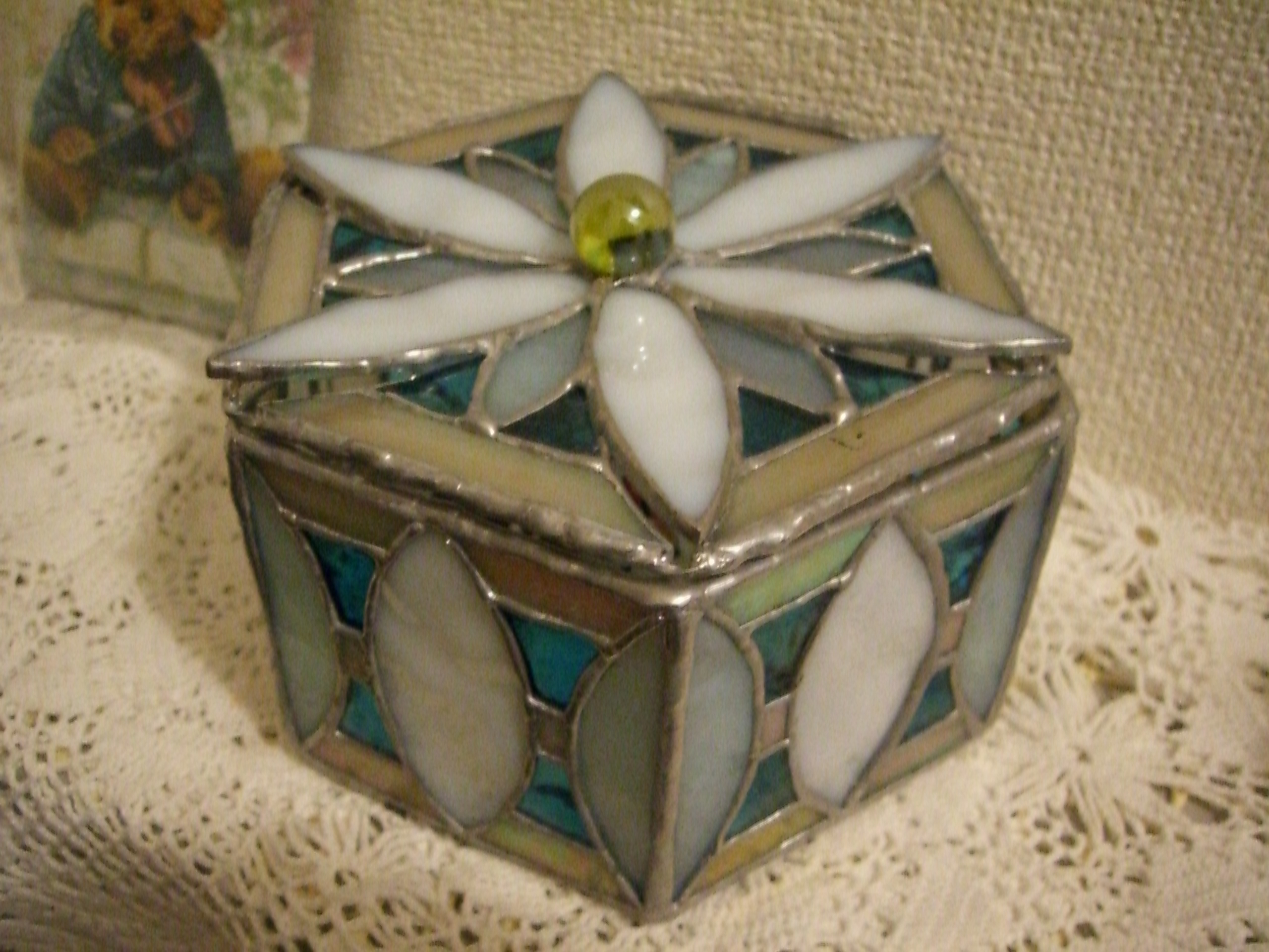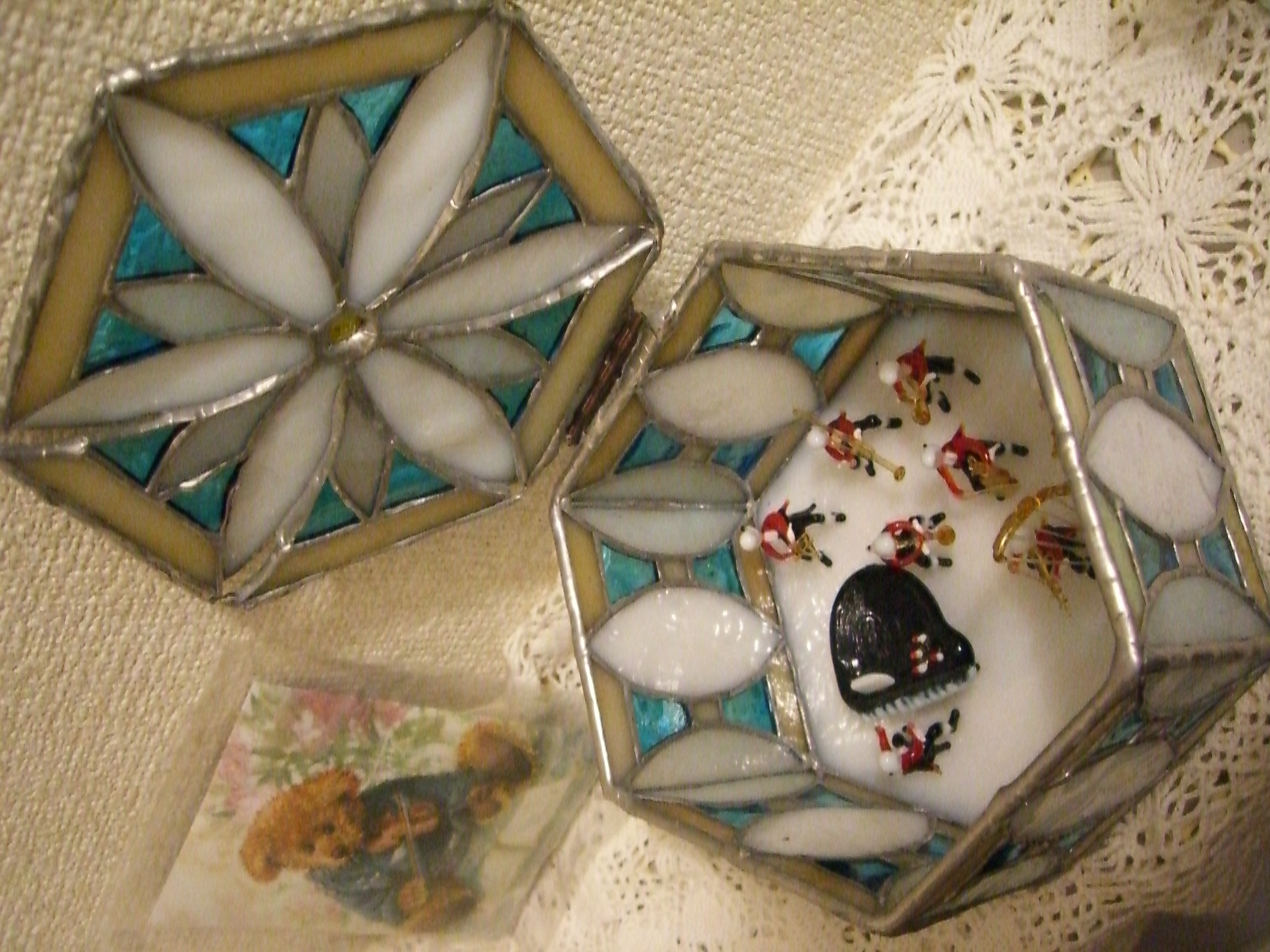 In my history, this is the largest stained glass piece. The diameter is 35 cm. Cause there are no suitable place in my home, I asked my relative to put it in her big house.